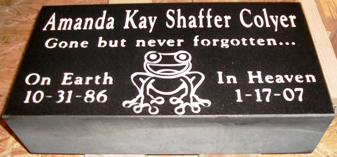 This custom gravestone features the touching epitaph, "Gone but not forgotten", along with the traditional name and dates as well as the phrase "Earth" above the birth date and "Heaven" above the death date and finally a unique and custom frog design to add a touch of charm to the overall design all of which are sandblasted and then enhanced by the addition of a white lithichrome stone paint. With our over 3000 design choices you are sure to find just the right design, but if not we will work with you to create the perfect design so that the your loved one can be memorialized perfectly at a price you can afford.