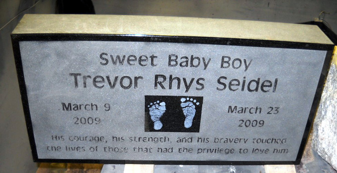 This intricately detailed custom infant funeral memorial is shown here in our high quality jet black granite with a large double processed epitaph box to highlight the inner center box which contains a laser etched photo of the newborn footprints and to emphasize the loving tributes of " Sweet Baby Boy", and "His Courage, His Strength, and His Bravery touched the lives of those that had the privilege to love him". This monument demonstrates the level of personalization that can be achieved with all of our accessories and design options. If you are looking to create a one-of-a-kind tribute to your loved one contact us today and let us help you find the perfect design options.