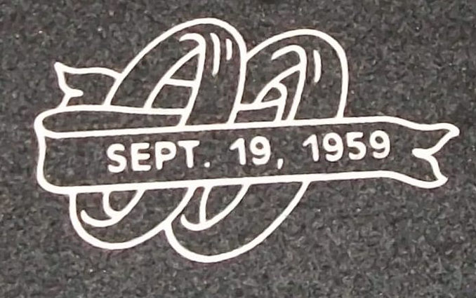 This headstone features a pair of wedding bands with a small ribbon style epitaph box with room for a wedding date or other personalization as shown here sandblasted on our high quality solid G654 Dark Gray granite and then enhanced by the addition of a white lithichrome stone paint.