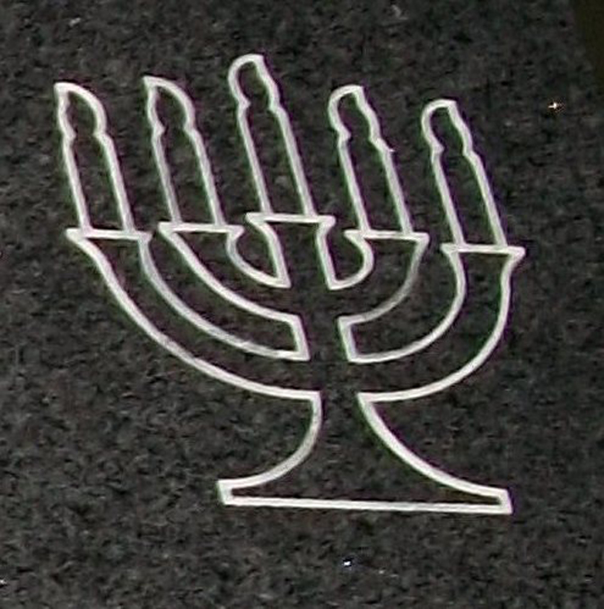 This simple yet symbolic design features a candelabra or what is know in the Jewish faith as the Menorah. Shown here sandblasted into our high quality solid G654 Dark Gray Granite and then enhanced by the addition of a white lithichrome stone paint.