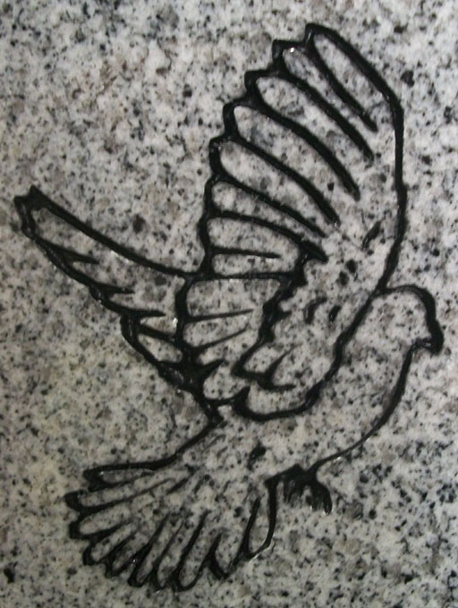 This peaceful cemetery headstone design 203 features a dove in flight and is shown here sandblasted on to our high quality solid G633 Gray granite and then enhanced by the addition of a black lithichrome stone paint. A great addition to any memorial you select.
