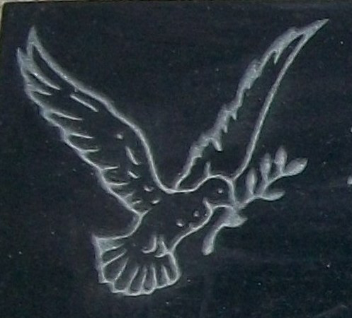 This tranquil cemetery headstone design 208 features a dove in flight clutching an olive branch in its beak symbolizing hope and God's promise to mankind. Shown here sandblasted on to our high quality jet black granite.