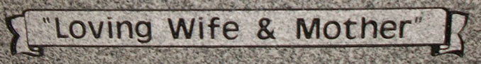This elaborate banner style epitaph box is shown here completed with the title, "Loving Wife and Mother", but it can be personalized with any epitaph you select. This headstone design 1641 is shown here completed on our high quality solid Gray Granite and then enhanced by the addition of a black lithichrome stone paint.