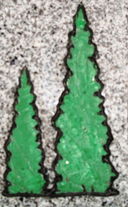 This engraved evergreen tree silhouette funeral monument design 3069 is shown on our high quality solid Gray Granite and is outlined by a black lithichrome stone paint and enhanced in the center by the addition of a green lithichrome stone and also combines two different sizes of the single evergreen tree to create the illusion of a forest. The use of white or black lithichrome stone paint to enhance characters or designs is an optional, but free of charge service. The addition of colored lithichrome paint such as green, on this design incurs an additional fee.