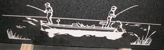 This intricately detailed landscape headstone design 1512 features a pair of fisherman in a boat out on a lake or pond hoping for the big catch of the day. A great design for any nature-lover or life long fisherman. Shown here sandblasted on our high quality solid G654 Dark Gray Granite and then enhanced by the addition of a white lithichrome stone paint.