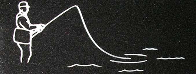 This engraved funeral memorial design 1421 features a fisherman out on a lake hoping to make a catch, and is shown here on our high quality solid jet black granite and enhanced by the addition of a white lithichrome stone paint.