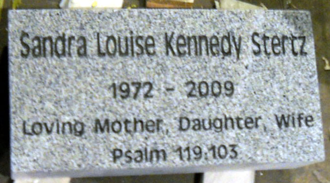 This high quality solid granite flat cemetery grave marker is shown completed by sandblasting the touching epitaph in an antique olive medium font. The tribute of "Loving Mother, Daughter,and Wife" followed by the Bible Verse Reference of Psalms 119:103 completes this memorial perfectly.