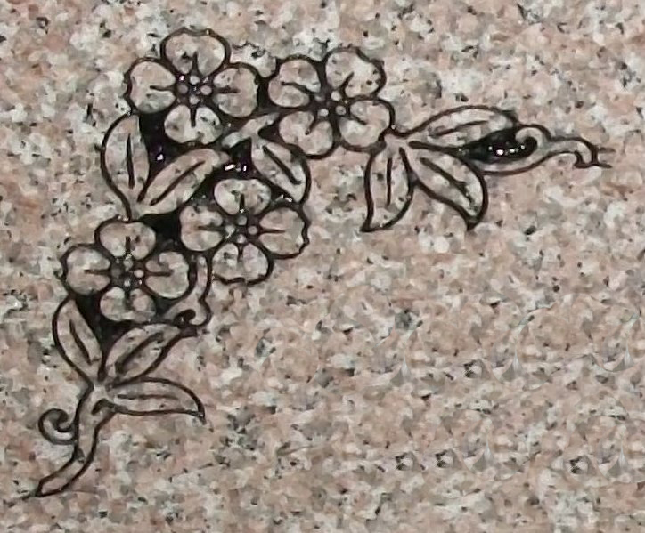 This simple and sweet cemetery headstone design features a branch of flowering dogwood and is shown here engraved into our high quality solid Anxi Granite and then enhanced by the addition of a black lithichrome stone paint.