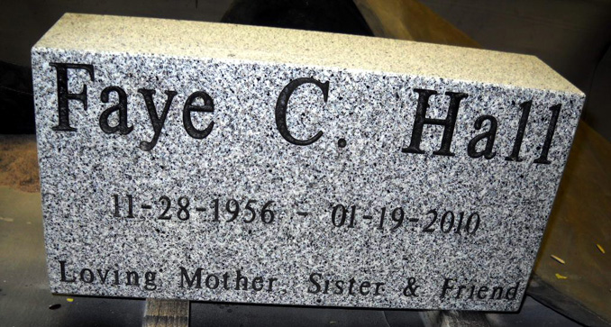 This completed high quality solid G633 light gray granite cemetery marker is shown with basic engraving and the epitaph "Loving, Mother, Sister, and Friend" all of which are enhanced by the addition of a black lithichrome stone paint.