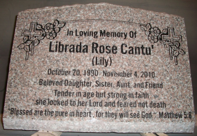 This loving tribute to a life cut short features our Cross and Dogwood Flower Headstone Design 569 followed by the traditional name and dates, a custom epitaph and a bible verse all of which was sandblasted into our high quality solid G663 Granite and then enhanced by the addition of a black lithichrome stone paint.