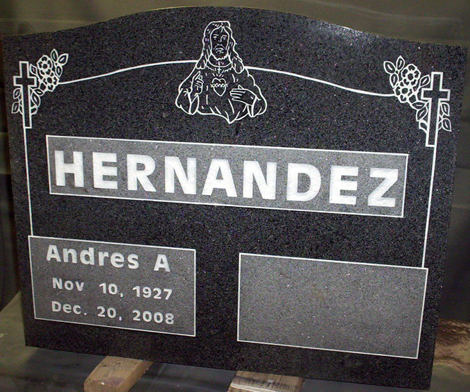 This extraordinary headstone is shown with so many optional design features it really showcases just how personalized you can make your memorial. This dark cloud grey monument is shown with three double processed epitaph boxes with sandblasted outlines. This service does incur an additional fee but it really produces a striking effect. The entire epitaph area is outlined and adorned at each of the top corners with a beautiful cross/floral design and the cemetery marker is completed with the addition of the Jesus sandblasted design in the top center. The epitaph is completed in an antique olive bold font and highlighted with a white lithichrome paint. We offer over 1000 various font styles and standard designs. Click the link to see what we have available or contact us with original designs of your creation.