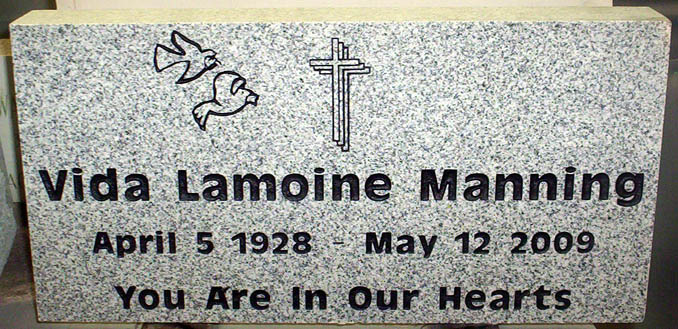 This 24x12x3 inch engraved marker is large enough in size and versatile enough to be used as either a single monument as shown or a companion memorial. The epitaph which includes the phrase, "You Are In Our Hearts" was completed by sandblasting in the antique olive bold font and highlighted by a black lithichrome stone paint. The optional dove and the three layered cross design capture the devout nature of your loved one and make this tribute a peaceful one. To view a price guide of our standard sandblasted designs click on the link or contact us for more information.