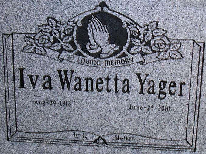 This engraved headstone memorial design 2019 features a large border style open bible epitaph box topped by a cameo style pair of praying hands followed by a rose garland and a ribbon that reads "In Loving Memory" and provides plenty of room for customization such as the traditional name and dates, a brief epitaph or as shown her the titles of "Mother" and "Wife" added to the base of the book all sandblasted and then enhanced by the addition of a black lithichrome stone paint