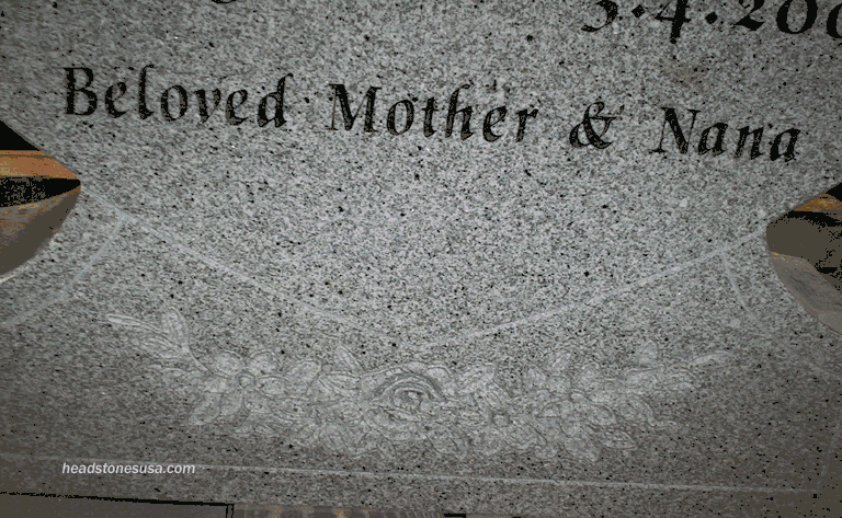 This simple yet enchanting tombstone features a beautiful stenciled flower design at its base. It is made of solid G614 granite so it will lovingly memorialize your loved one without breaking your budget. The stenciled design is included in the pricing as well as the basic engraving shown .