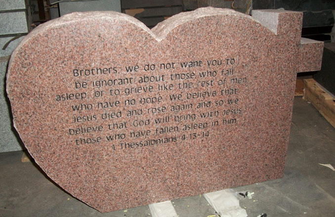 This versatile monument features a polished back to accommodate a lot of custom epitaphs, poems, or even a bible verse as shown here sandblasted and then enhanced by the addition of a black lithichrome stone paint.