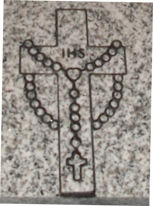 This intricately detailed cemetery headstone design is very symbolic and a great way to pay tribute to your devout loved one. It features a basic cross with the initials IHS which traditionally represent the phrase In His Service and a rosary is draped over the arms of the cross. Shown here sandblasted into our high quality solid G614 Gray Granite and then enhanced by the addition of a black lithichrome stone paint.