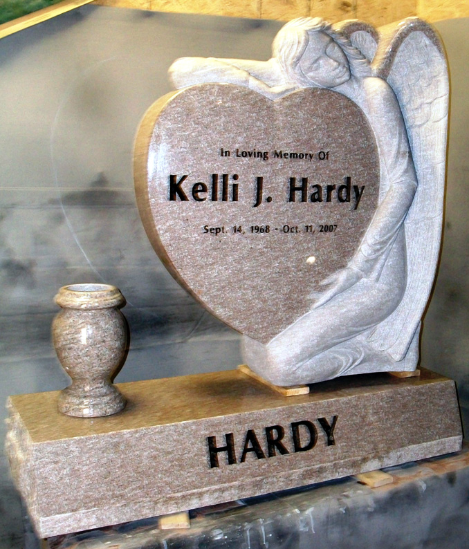 This absolutely beautiful engraved three dimensional Img 8 Angel and Heart Cemetery Monument is shown here with basic engraving, the epitaph "In Loving Memory of", and the surname on the base all enhanced by the addition of a black lithichrome stone paint.