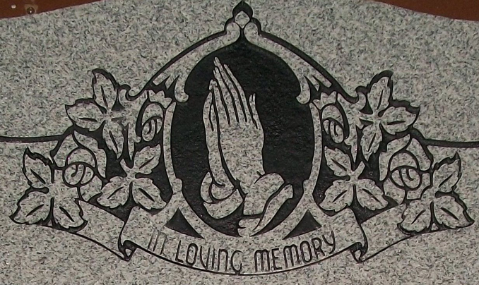 This beautiful religiously themed design features a cameo style set of praying hands set in the middle of a flower swag which adorns the top of an open bible style epitaph box. Shown here sandblasted into our high quality solid Gray Granite and then enhanced by the addition of a black lithichrome stone paint.