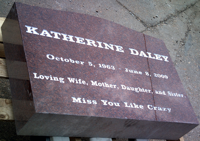 This stunning India Red Granite is the ideal backdrop for your loving epitaph to celebrate the life of your loved one. This monument is shown using a volta bold font to complete the epitaphs, "Miss you like crazy", and "Loving wife, mother, daughter, and sister" enhanced with a white lithichrome stone paint. A great way to embellish this already beautiful headstone would be to add a ceramic photo to show the world just how you want your loved one to be remembered. To view our selection of porcelain portraits click on the link or contact us for more information.