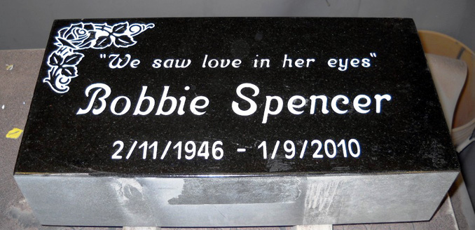 This engraved jet black 16x8x4 high quality solid jet black cemetery gravestone is shown here completed with a beautiful flowing font style and a unique tribute of "We saw love in her eyes" enhanced by the addition of a corner design which is our rose in full bloom floral design 1082 all highlighted by the addition of a white lithichrome stone paint.
