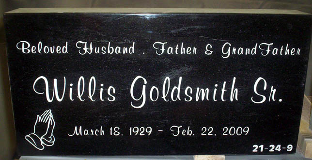 This dramatic jet black 12x24x4 inch gravestone marker is shown completed with an unusual murray hill bold font and the epitaph, "beloved husband, father, grandfather" and an optional praying hands design all of which are highlighted by the addition of a white lithichrome stone paint for emphasis. Another great way to customize a jet black memorial is to add a laser etched photo or design. To view our selection and price guide for this service click on the link or contact us for details.