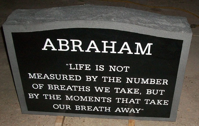 This gorgeous high quality solid jet black upright monument is versatile and can be used for an individual tribute or a companion monument as shown here with the surname and a custom epitaph that reads, "Life is not measured by the number of Breaths we take, but by the monuments that take our breath away" sandblasted and then highlighted by the addition of a white lithichrome stone paint.