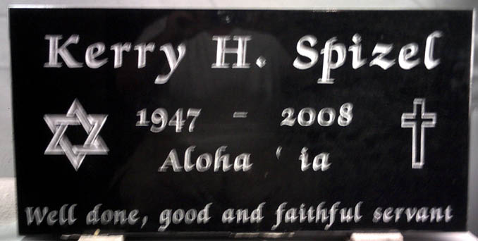 This gorgeous and impressive Engraved Jet Black Monument Marker is shown completed in a zapf chan bold font and epitaphs that include a Hebrew phrase "Aloha ' ia" and the religious phrase, "Well done good and faithful servant" along with the Jewish star of David and a cross. We offer over 1000 different font styles and standard designs so the possible ways for you to customize the monument for your loved one is nearly limitless and we always welcome designs of your original creation. If you need design ideas for the perfect tribute click on the link to our information page or contact us and we will guide you through the process.
