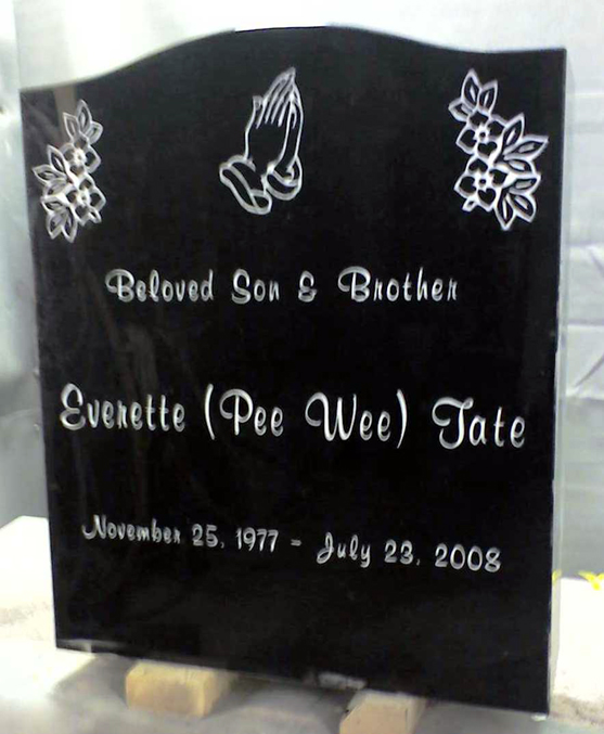 This engraved jet black upright monument features the traditional name and dates as well as a nickname and the epitaph "Beloved Son and Brother" all completed in the Murray Hill Bold Font style (one of over 1000 available font styles) as well as our praying hands design D-58 and the Flowering Dogwood Design D-30 all sandblasted and highlighted by the addition of a white lithichrome stone paint.
