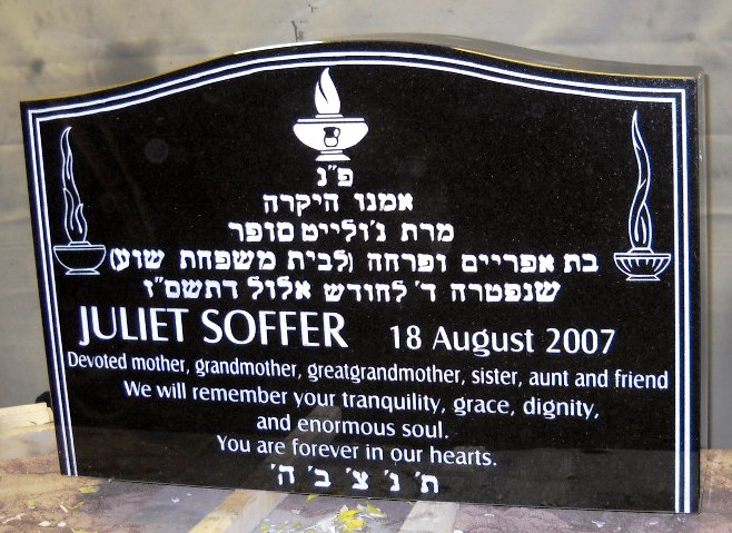 This engraved beautiful and highly detailed cemetery monument is truly a tribute to the life of the individual, and just one example of the level of customization and personalization available. This memorial features foreign characters (Jewish), custom Lamps of God designs, along with our Lamp of Knowledge Design 3042 and the epitaphs, "Devoted Mother, Grandmother, Greatgrandmother, sister, aunt, and friend" as well as the amazing tribute of: "We will remember your tranquility, grace, dignity, and enormous soul. You are forever in our hearts" all encased by a drape style border. All of the characters and designs are sandblasted and then highlighted by the addition of a white lithichrome stone paint.