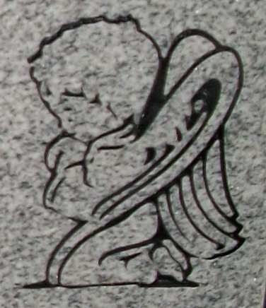 This touching cemetery headstone design 173 features an infant angel kneeling, with its head bowed and hands clasped in prayer. A great choice for a memorial for a baby or young child. Shown here sandblasted on to our high quality solid Gray Granite and then enhanced by the addition of a black lithichrome stone paint.