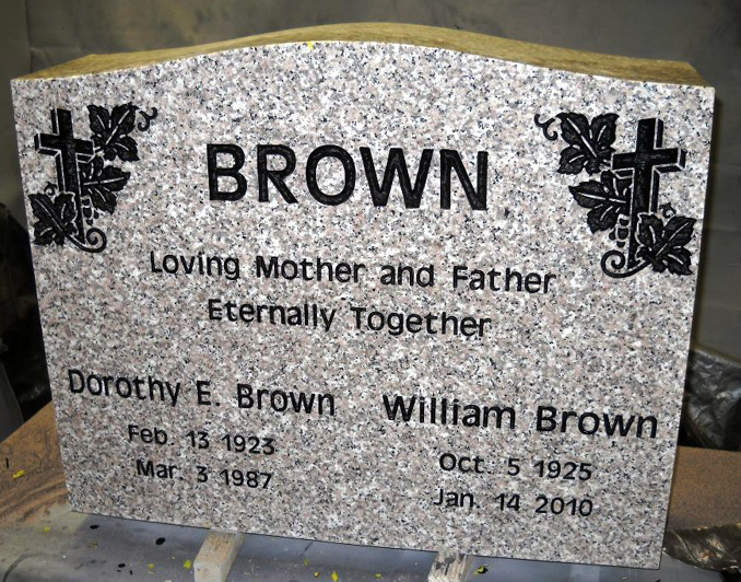 This beautiful engraved upright Cemetery Headstone is shown here completed as a companion memorial, and features our striking and symbolic Grape Leaf and Cross Design D-39 in each upper corner, the surname across the top followed by the traditional two name and dates as well as the epitaphs, "Loving Mother and Father", and "Eternally Together" all sandblasted and then enhanced by the addition of a black lithichrome stone paint for emphasis.