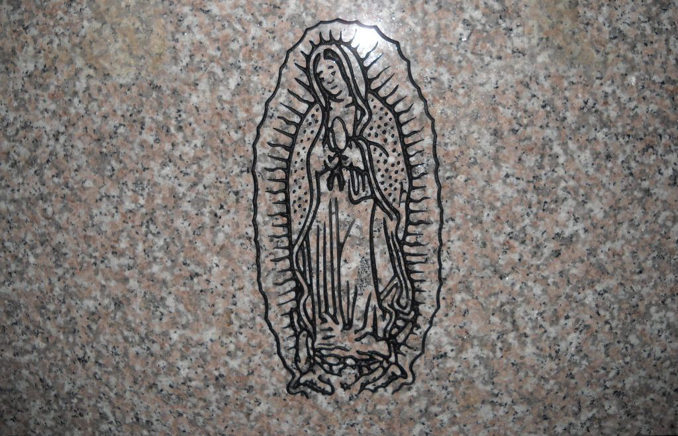This religious icon, the Lady of Guadelupe Cemetery Monument Design D-46 is shown here sandblasted onto our high quality solid Anxi granite and enhanced by the addition of a black lithichrome stone paint.