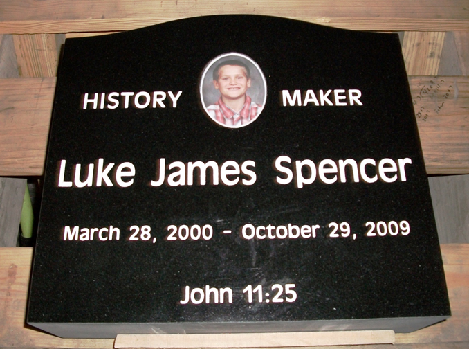 This beautiful high quality solid jet black upright cemetery memorial features an oval ceramic photo (just one of the many sizes and style available), the traditional name and dates, as well as the title "History Maker" and a favorite bible verse reference of "John 11:25" all sandblasted and then highlighted by the addition of a white lithichrome stone paint.