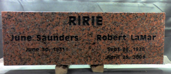 This gorgeous marble red solid granite marker is shown as a companion monument with only the most essential of epitaphs. Both the large bold surname gracing the top and the individual epitaphs are completed in a black lithichrome stone paint which is an optional but free of charge service. For design ideas on how to create your own custom gravestone click on our information link or contact us today. We will assist you every step of the way and make the whole process as effortless as possible.