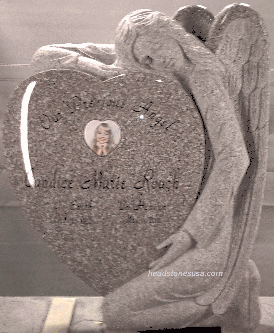 This serene angel memorial embraces a heart the perfect size for personalization. This monument is shown with a porcelain portrait which is an optional feature that is available in a variety of shapes and sizes.