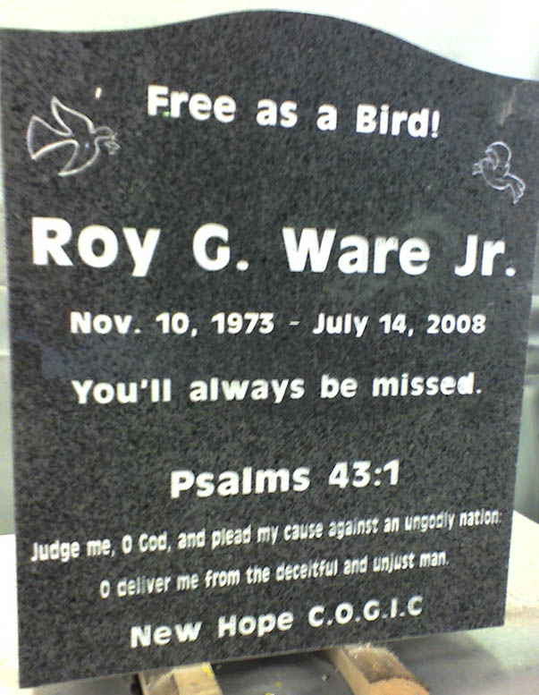 This dark cloud gray headstone is adorned with a unique epitaph, an awe inspiring bible verse, and two peaceful doves. The addition of the white litho paint displays the lettering and designs beautifully and makes this a remarkable way to memorialize your loved one. Contact us for ideas on how to customize the perfect grave marker for your loved one.