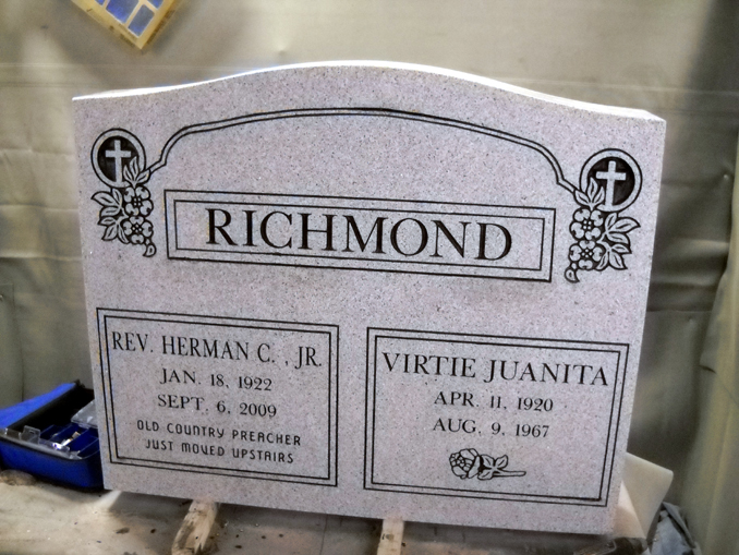 This beautiful and unique upright cemetery memorial marker features a complete design that features three frame style epitaph boxes and a drape style motif with flowering dogwoods and a cross in each corner which is further personalized by the addition of the unusual epitaph "Old Country Preacher Just Moved Upstairs" and our single rose in full bloom design 1120 along with the traditional surname and two individual names and dates all sandblasted and enhanced by the addition of a black lithichrome stone paint (which is also available in white).