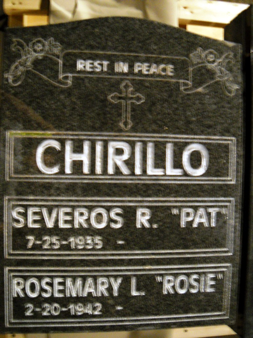 This high quality solid G654 Dark Cloud Grey N-01 model Cemetery Tombstone is shown here highly stylized and with lots of customization. The memorial includes the Trefoil or Fleury Cross Style Design D-114, two of the Victorian Wild Rose Design 3043 with a large flowing ribbon style banner and the epitaph "Rest In Peace" and the Surname and individual engraving enhanced by the addition of our Basic Border Epitaph Boxes Design 1664 all of which are highlighted with the addition of a white lithichrome stone paint for emphasis.