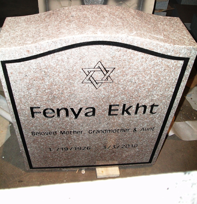 This engraved and completed upright monument features a custom yet basic outline style border, our Star of David D-82 design, the traditional name and dates as well as the tribute of "Beloved Mother, Grandmother, and Aunt" all sandblasted and then enhanced by the addition of a black lithichrome stone paint.