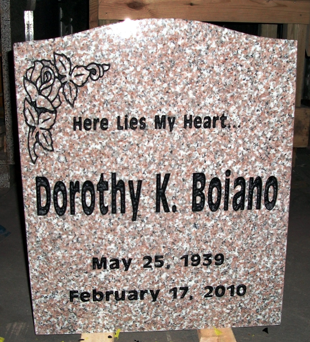 This endearing engraved N-01 model upright cemetery marker in Anxi Granite features the charming epitaph of "Here Lies My Heart..." followed by the traditional name and dates as well as the classic beauty of a rose in full bloom in the upper right hand corner all of which were sandblasted and then enhanced by the addition of a black lithichrome stone paint (which is also available in white).