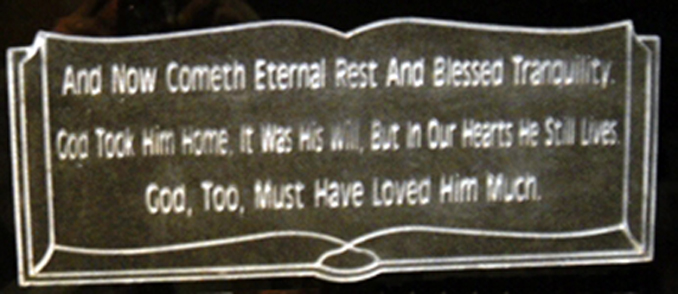 This Open Book Funeral Monument Design D-7 is shown here sandblasted onto our high quality solid jet black granite. The open book features a custom double-processing interior (which is an optional service that incurs additional charges) and a unique personalized epitaph that reads "And now cometh eternal rest and blessed tranquility. God took him home. It was his will. But in our hearts he still lives. God too must have loved him much" and showcases the limitless possibilities available for customization with our over 2000 design options.