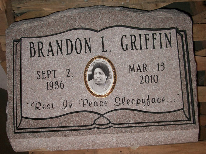 This impressive tribute to a life cut short is completed on our high quality solid Anxi granite and features our open bible style epitaph box headstone design D-7 with a double processed center (an optional service available upon request that incurs additional cost) and an outline that is enhanced by the addition of a black lithichrome stone paint.