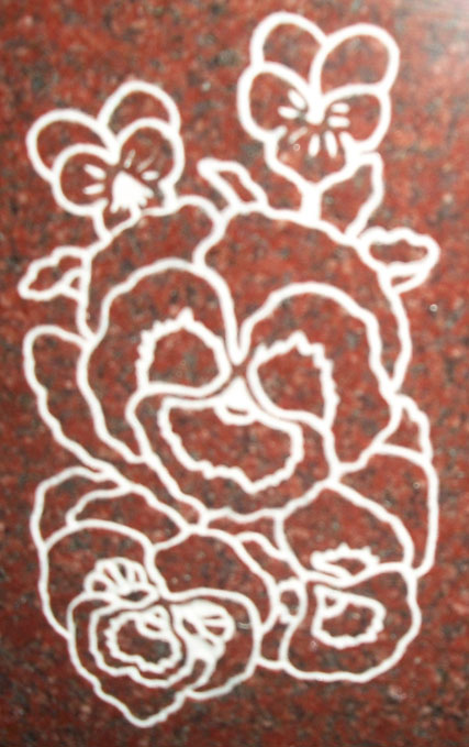 This beautiful bouquet of Pansies cemetery headstone design 1640 is a versatile design that can be used with the scroll style epitaph boxes or without out as shown here sandblasted into our high quality solid India Red Granite and then enhanced by the addition of a white lithichrome paint. Contact us today and let us help you create the perfect tribute to your loved one.