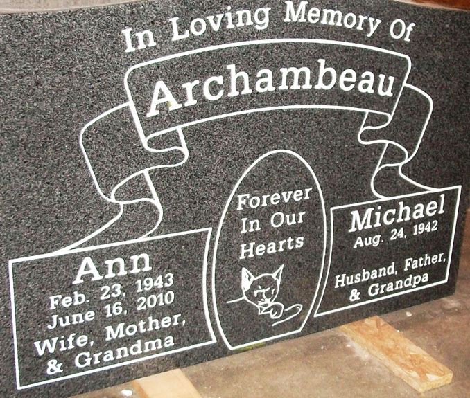 This panel style cemetery headstone design 1651 features a ribbon style banner across the top followed by two individual epitaph boxes with a cameo style oval that rests in between the two epitaph boxes that is perfect for a design (as shown) or a ceramic photo. This panel design is ideal for a companion monument (as shown) but can also be used for an individual or family tribute. Shown here sandblasted on to our high quality solid G654 Dark Gray Granite and then enhanced by the addition of a white lithichrome.