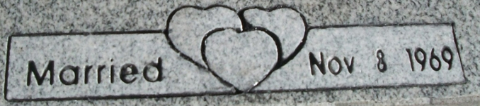 This loving panel headstone design 1660 features a banner and three interlocking hearts. Shown here for use on a companion monument, the banner is engraved with the wedding date and the word "Married" all of which are sandblasted on to our high quality solid gray granite and then enhanced by a black lithichrome stone paint.