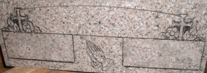 This religious themed design is inclusive in that it includes a drape style design across the top with a cross/floral design in each upper corner with a space perfect for a surname or brief epitaph followed by a pair of epitaph boxes perfect for use as a companion monument with a pair of praying hands in the center. If you are looking for a way to memorialize your devout loved ones this is the design for your monument.