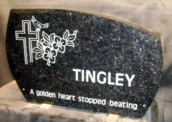This beautiful and uniquely shaped upright cemetery memorial is has a polished front and back with plenty of room for customization. As shown here in use as a family monument, the front is engraved with the surname, a quote that says, "A Golden Heart Stopped Beating" and a combination design that combines our cardinal design 195 with the Cross and Dogwood Garland Design 583 all sandblasted and then enhanced by the addition of a white lithichrome stone paint.