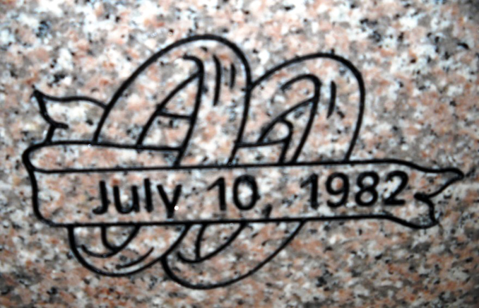 This engraved rings and ribbons cemetery headstone design D-63 is shown here sandblasted onto our high quality solid Anxi granite and enhanced by the addition of a black lithichrome stone paint. The ribbon provides ample room for a wedding date or other brief epitaph as shown here.