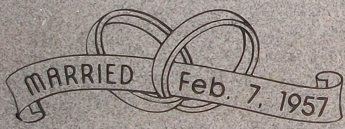 This cemetery headstone design 1699 features a pair of interlocked wedding bands and a ribbon style banner with room for a brief epitaph or a wedding date as shown here sandblasted on to our high quality solid G633 Gray Granite and then enhanced by the addition of a black lithithchrome stone paint. A great choice for any companion monument you choose
