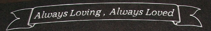 This simple ribbon style banner or epitaph box is perfect for use with a surname or a custom epitaph as shown here, which reads "Always Loving, Always Loved" and is completed by sandblasting on our high quality solid G654 Dark Gray Granite and then enhanced by the addition of a white lithichrome stone paint.